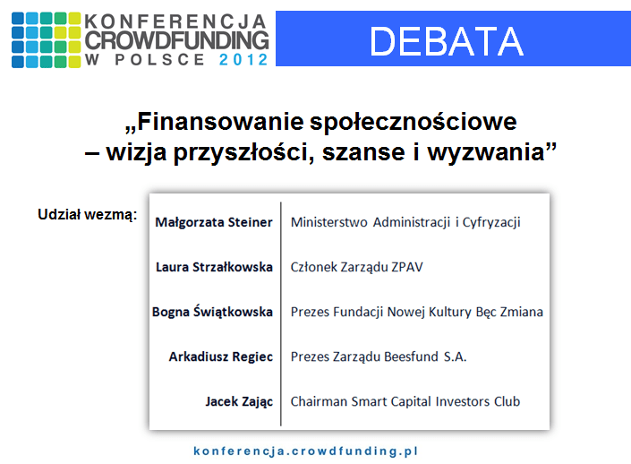 Z radością prezentujemy uczestników debaty, która zakończy konferencję „Crowdfunding w Polsce 2012”. Jej celem jest ocena stanu rozwoju finansowania społecznościowego w Polsce oraz dyskusja nad szansami i kierunkami jego rozwoju w przyszłości. Paneliści reprezentują różne grupy zainteresowane tematyką crowdfundingu: